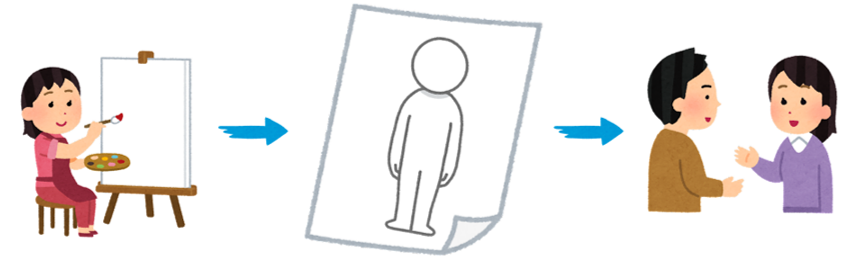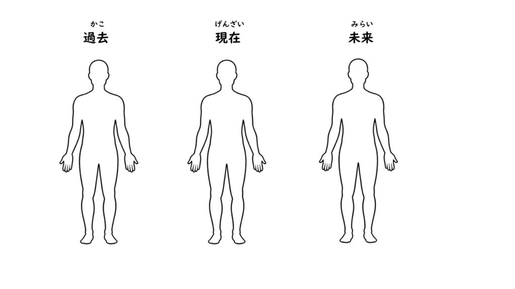 皆さんの体の中には、どんなことばがありますか? ことばは、皆さんといっしょに変わっていきます。今日は『過去』『現在』『未来』の3つのシルエットを使って、あなたのことばの旅を絵に描いてみましょう。