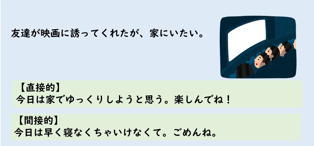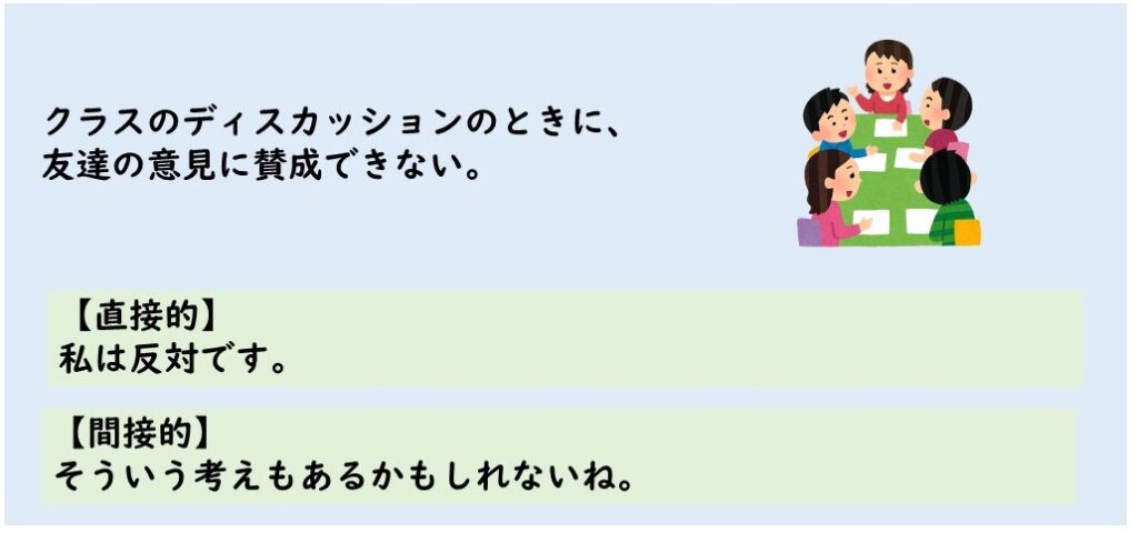 - 上記の場面で、「間接的」な表現をより選んだ学生は、(1) 誰と、(2) どんな状況だったら直接的なコミュニケーションスタイルになりますか。