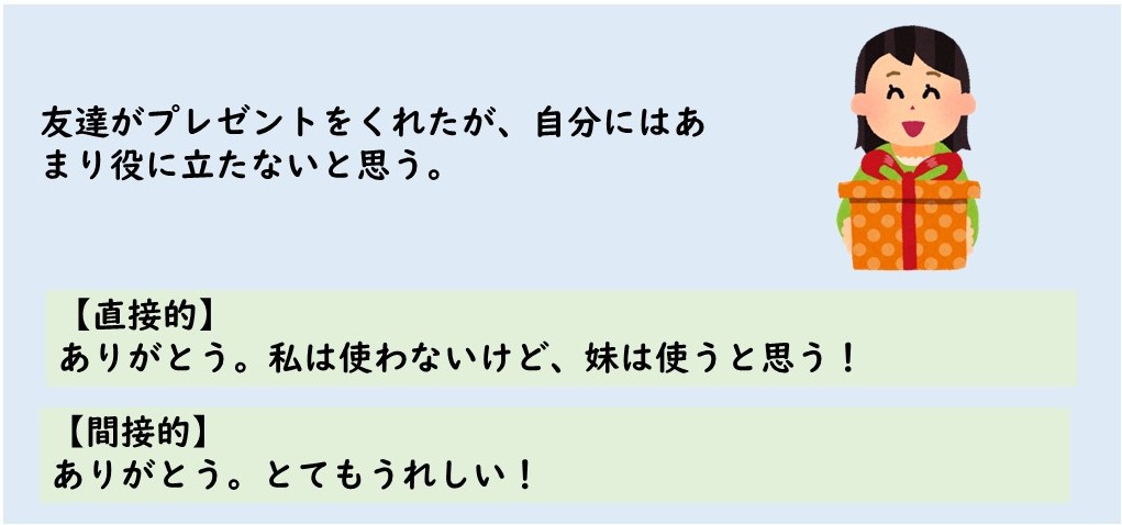 - 言葉以外の「文脈(context)」「非言語的要素(non-verbal cues)」「暗黙の了解(implicit understanding)」で意味が伝わる文化